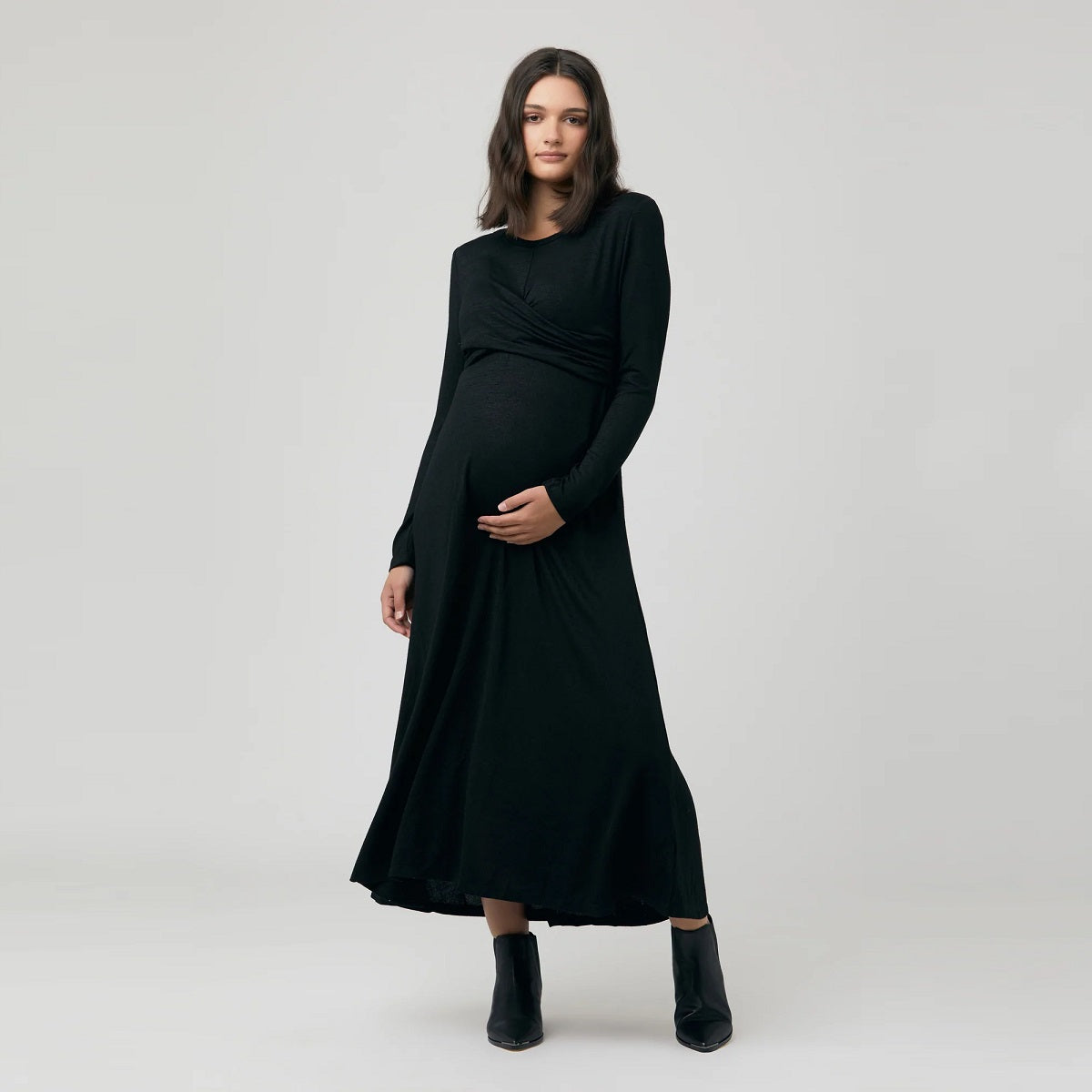 Cut from a soft jersey knit, our Tara Cross Front Nursing Dress features a midi-length skirt and high neckline. The twist front feature at the bust lifts up to reveal easy nursing access.
